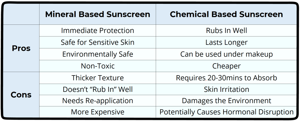 Mineral sunscreens are ideal for sensitive skin and environmental safety but may feel heavier and cost more. Chemical sunscreens are lightweight, blend easily, and are budget-friendly, but may irritate skin, take longer to work, and have environmental drawbacks. Choose the sunscreen that best matches your needs and values.