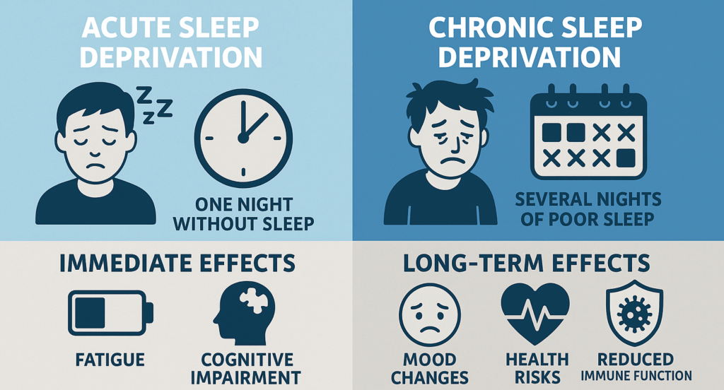 Acute sleep deprivation causes short-term issues, while chronic sleep deprivation leads to serious health risks. Both types disrupt your focus, mood, and physical wellbeing significantly.
